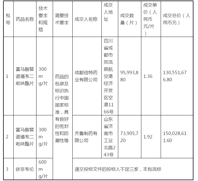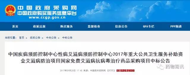 2017年重大公共卫生服务补助资金艾滋病防治项目国家免费艾滋病抗病毒治疗药品采购项目中标公告