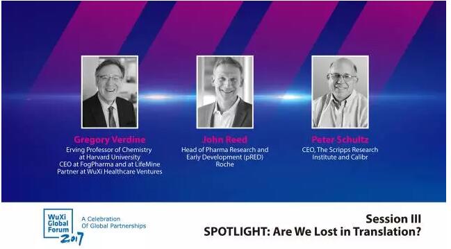 将突破性的科学成果转化为造福患者的产品是一个漫长且曲折的过程,也是业内关注的焦点。罗氏药物研究与发现总负责人John Reed博士、Scripps研究所与加州生物医学研究所(California Institute for Biomedical Research,Calibr)首席执行官Peter Schultz博士与连续创业者、哈佛大学 Gregory Verdine教授就是这样三位有着丰富转化经验的大咖。在“SPOTLIGHT: Are We Lost in Translation?”的专题讨论中,这三名大咖从各自的机构出发,从跨国大型药企、国际知名学府、以及新锐投资机构的不同角度,分享科学转化过程中的大量第一手经验。