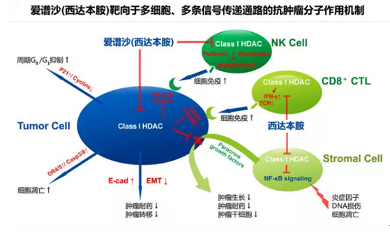 西达本胺通过对特定HDAC亚型的抑制及由此产生的染色质重构与基因转录调控作用(即表观遗传调控作用),抑制淋巴及血液肿瘤的细胞周期并诱导肿瘤细胞凋亡;诱导和增强自然杀伤细胞(NK)和抗原特异性细胞毒T细胞(CTL)介导的肿瘤杀伤作用及抑制肿瘤病理组织的炎症反应,不仅能直接贡献于对T淋巴瘤中循环肿瘤细胞及局部病灶产生疗效作用,同时也可能应用于诱导和增强针对其他类型肿瘤的抗肿瘤细胞免疫的整体调节活性。