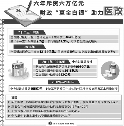 财政部数据显示,2011年至2016年,中央财政共安排新农合和城镇居民医保补助资金9930亿元、公共卫生服务补助资金2618亿元、公立医院补助资金782亿元。另外,从2012年起,中央财政每年安排补助资金支持基层医疗卫生机构和村卫生室实施国家基本药物制度,至2016年共补助455亿元。