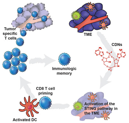 肿瘤微环境(TME)天然免疫的信号传导是肿瘤特异性T细胞的激活和肿瘤浸润性淋巴细胞(TIL)浸润的关键步骤。其中I型IFN对肿瘤激活的T细胞活化起着关键作用。这样,STING不仅诱导Ⅰ型干扰素基因的表达,在天然免疫信号通路中起着重要作用;STING激动剂能激活包括树突状细胞等免疫刺激细胞,改变肿瘤微环境并诱导了肿瘤特异性T细胞的产生。