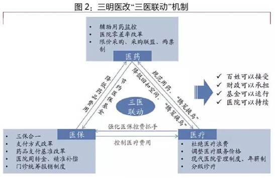 会议提出了探索“三险合一”的管理模式、建立医疗机构考核机制、建立基本医疗保险周转金制度、引入各级医院间竞争机制、成立药品集中采购监管与使用工作领导小组、扩大门诊报销范围和比例、改革患者预缴金制度、积极推进按单病种付费与临床路径管理等十三项措施,明确了医药、医保、医疗“三医联动”综合改革的路径。