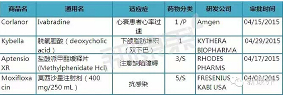 2015年04月份美国FDA共审批通过4种新药,1类新分子实体药物2个; 3类新剂型药物1个;;5类新规格或新生厂商药物1个。
