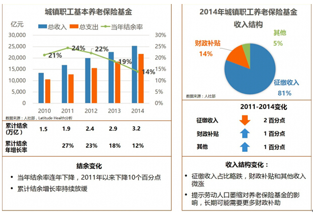 中国的城镇职工养老保险基金呈现出微妙的变化,从一个重要侧面反映出未来可能的风险。首先,城镇职工养老保险基金的当年结余率一直在下降,从2011年的24%下降到2014年的14%。第二,累计结余的增长率一直在放缓,2011年相比前一年的累计结余增加了27%,之后每年都在下降,2014年增加的比例只有12%。第三,城镇职工基本养老保险基金收入来源也在变化。征缴收入占比2011年为83%,之后持续下降,2014年占81%。财政补贴占比从2011年到2014年上升了1个百分点,为14%。其他收入(可能包括利息等)则上升了1个百分点,2014年为5%。这些变化只是细微的,但可能提示未来劳动人口的增长将遇到瓶颈,征缴的比例可能进一步下降,需要更大的财政补贴支持。