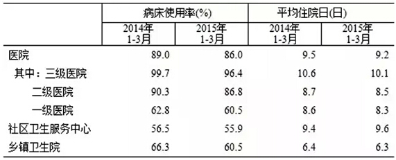 2015年1-3月,医院病床使用率为86.0%,同比降低3.0个百分点,社区卫生服务中心为56.5%,同比降低0.6个百分点,乡镇卫生院为60.5%,同比降低5.8个百分点。三级医院平均住院日为10.1日,同比缩短0.5日,二级医院平均住院日为8.5日,同比缩短0.2日。