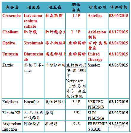 表12015年03月份美国FDA审批通过新药