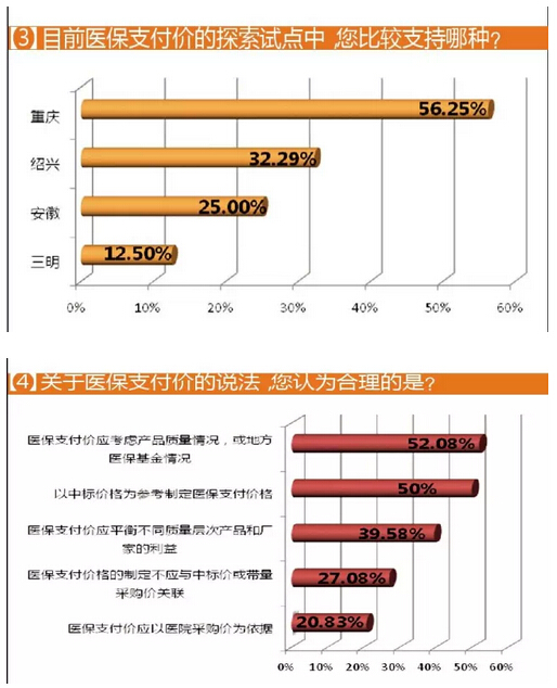 本次问卷调查中,医保支付价标准制定的参考依据,中标价为依据和应考虑产品质量情况,以及地方医保基金情况的选项获得了过半企业的选择。可以发现,目前重庆、三明、安徽和绍兴四地将医保支付标准与采购价或中标价相关联,在方向上是获得企业支持的。