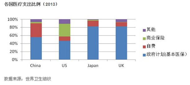 根据世界卫生组织2013年的数据,中国医疗支出中个人自费比例达到34%,是欧美及日本的两倍还多,相比之下美国的个人自费比例是11%,日本是14%,英国只有9.9%。医保是中国医疗的核心支付方式,占整体医疗支付的56%。这个比例相比日本和英国这样福利覆盖很全面的国家还是很低的,日本和英国的政府医疗支付占总体医疗支付的比例均达到82%。此外,中国缺乏商业保险作为补充支付方,商业支付方式仅占总体医疗支付的10%不到。以商保为核心支付的美国这个比例达到了31%。