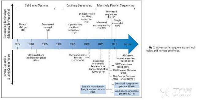 NGS技术可以快速实现全基因组DNA、mRNA、转录因子部位、miRNA、染色质结构以及DNA甲基化类型的鉴定。此类技术有数种测序平台,可分别用于全基因组、全外显子组、全转录组(RNA测序)以及全表观基因组分析,它们通过“并行合成测序法,利用可逆的终止子核苷酸实现了对整合碱基的添加及探测”,而无需电泳胶及预先了解基因组序列信息。有数种新型NGS平台正处于研发阶段,如Illumima HiSeq 2500及Ion Torrent Proton,此类平台可在1天时间内完成人类基因组测序,这将进一步推动癌症基因组学在临床方面的应用。目前,NGS技术正在临床领域得到快速应用,涉及了几乎所有肿瘤类型。作为一种研究工具,NGS技术可用于探知肿瘤分子学机制、发现新药物靶点以及筛选临床试验候选患者等。目前,约需1周时间即可拿到测序结果,如果要进行数据分析,则至少需要2周时间,试剂费用约3,500美元至5,000美元。对NGS而言,一个主要挑战是所获取数据的完整性,并且需要稳健的生物信息学工具,以全面地对诸多同时获取的各个基因组异常相关功能性影响做出深入分析。在NSCLC中,除了已知热点原癌基因突变或基因重排外,通过NGS技术还可检测到之前在其他癌症类型中见到的基因异常,并可在不清楚相关生物学功能的情况下,发现诸多新的基因异常。目前已有一种基于通路的综合性系统,可通过生物途径解读已知及新型癌症标记相关数据。在理想情况下,需要通过前瞻性、多生物标记物同步进行的治疗性临床试验,对个体化癌症治疗晚期NSCLC患者的临床可能性及疗效进行评价。