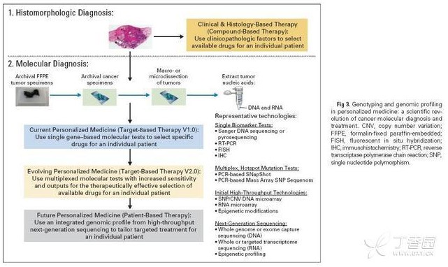 基于DNA的高通量基因组技术极大地加快了个体化抗癌药物的衍化过程。新一代测序技术(NGS)摒弃了必须依赖电泳胶或引物作为筛分介质,也无需预知基因组序列的相关信息。此类高通量技术提高了核酸(DNA及RNA)测序速度,并降低了误差及单碱基测序成本。它的临床早期应用为癌症患者个体提供了快速而又广泛的分子学注解,为筛选出具有效应性且/或新型药物靶点及治疗方法,以及对潜在的致病机制进行描述提供了便利。将靶向治疗与对应的特异基因畸变进行匹配是个体化抗癌治疗中的重要一步,因此有望最终改善患者预后。