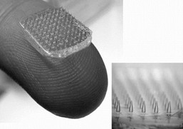 在探查了一条鱼的肠壁后,研究人员发现一种棘头虫——Pomphorhynchus laevis——使自己的吻突膨胀,以便更好地让身体嵌在软组织中。在这种新补丁上(样品如大图所示),排列着700微米高、坚硬的聚苯乙烯针状物(小图),这些针状物能穿透组织,然后,覆盖在每个针状物尖端的一种稀薄的水凝胶开始膨胀从而帮助固定补丁。这种水凝胶是一种根据一次性尿片的原料所设计出来的涂层,它一旦变湿即会膨胀。