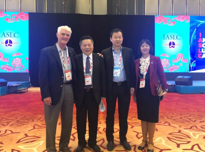 亚盛医药董事长杨大俊博士(右二)与国际著名肺癌专家、亚盛医药临床顾问委员会顾问Paul Bunn教授(左一),中国胸部肿瘤研究协作组主席吴一龙教授(左二),广东肺癌研究所副所长周清(右一)在会场