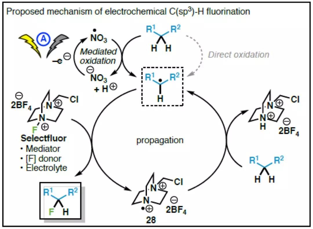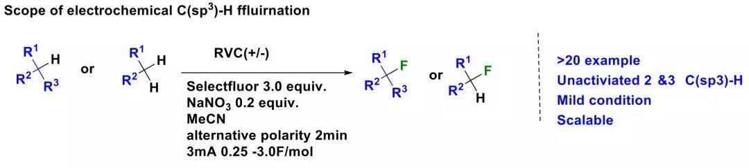 现代有机电化学合成领域中,仅有极少数的氟代方法可实现惰性脂肪C-H氟化反应。研究人员通过采用易得的氟试剂(Selectfluor),在RVC阳极氧化和硝酸盐添加剂的促进下,将多种活化或非活化的C-H键转化成相应的C-F键。该电化学氧化的C-H电氟化反应具有合成方法简单、底物适用范围广、易于放大等特点。