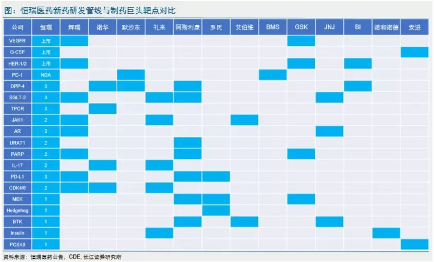 根据恒瑞医药年报,恒瑞医药有3个创新药(艾瑞昔布片、甲磺酸阿帕替尼片、马来酸吡咯替尼片)成功上市,2个创新药已申报上市;37个创新药处于不同临床阶段,其中进入III期的临床试验有7个,50多个创新药处于临床前研究阶段,还有多个创新药在美国、澳大利亚开展临床研究。目前恒瑞医药的研发管线已经基本实现了创新药热门靶点的全面布局(见下图),随着卡瑞利珠单抗、瑞马唑仑、恒格列净、瑞格列汀等多个重磅产品的陆续上市,恒瑞医药有望进入新药研发的丰收期。预计2020-2021年,恒瑞医药整体营收有望达到250-300亿元水平。