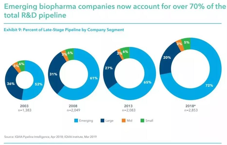这与日前IQVIA人类数据科学研究所(IQVIA Institute for Human Data Science)发布的医药产业研发报告获得的结论非常相似。IQVIA的报告发现,新兴生物医药公司进行的后期研发项目占2018年所有后期研发项目的72%。这是因为这些公司在增长速度最快的肿瘤学和孤儿药领域最为活跃,并且独自研发创新药品的能力得到提高。
