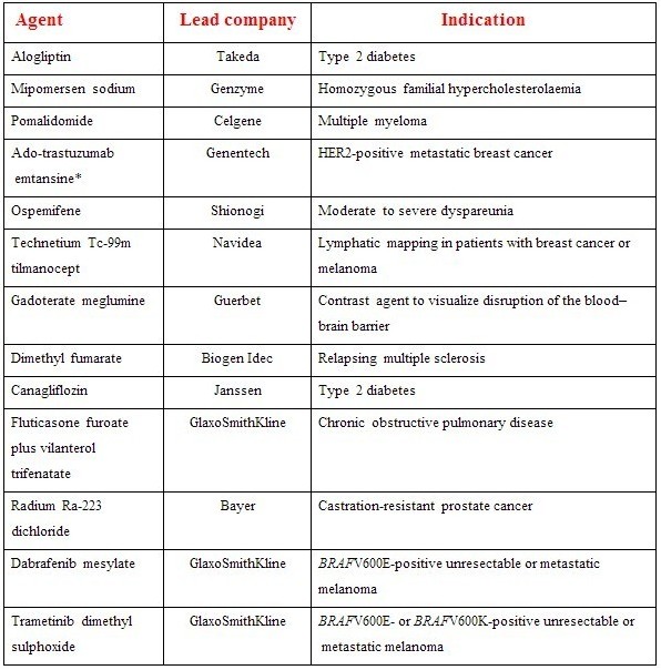 另外还有两个亮点新药,一个是强生旗下的Janssen药物公司的Canagliflozin,该药是在美国批准的第一个SGLT2抑制剂,SGLT2是一种钠依赖的葡萄糖转运蛋白, 所以Canagliflozin的适应症是2型糖尿病。值得一提的是该药最初由日本三菱旗下的田迈三菱制药(Mitsubishi Tanabe Pharma)研发,后转让给Janssen公司,如对这个日本公司感兴趣,可点击参阅我最近的一篇博文,日本三菱抢购一家研发H7N9疫苗的生物公司。另外一个是GSK的Trametinib,这个小分子化学药,是史上第一个靶向MEK(MAPK/ERK)激酶的新药。