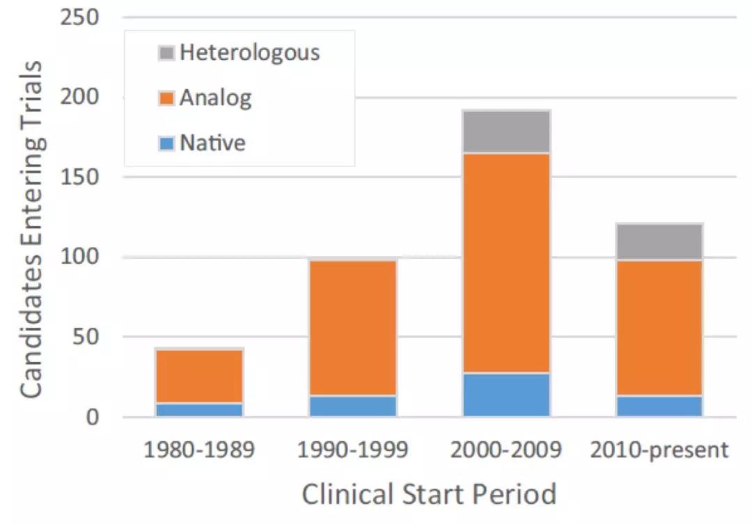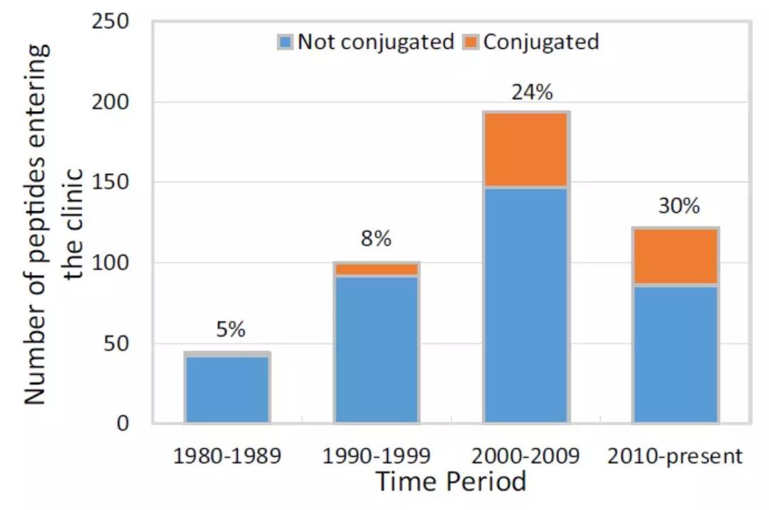 图1. 不同时期多肽临床候选药物的类型分布