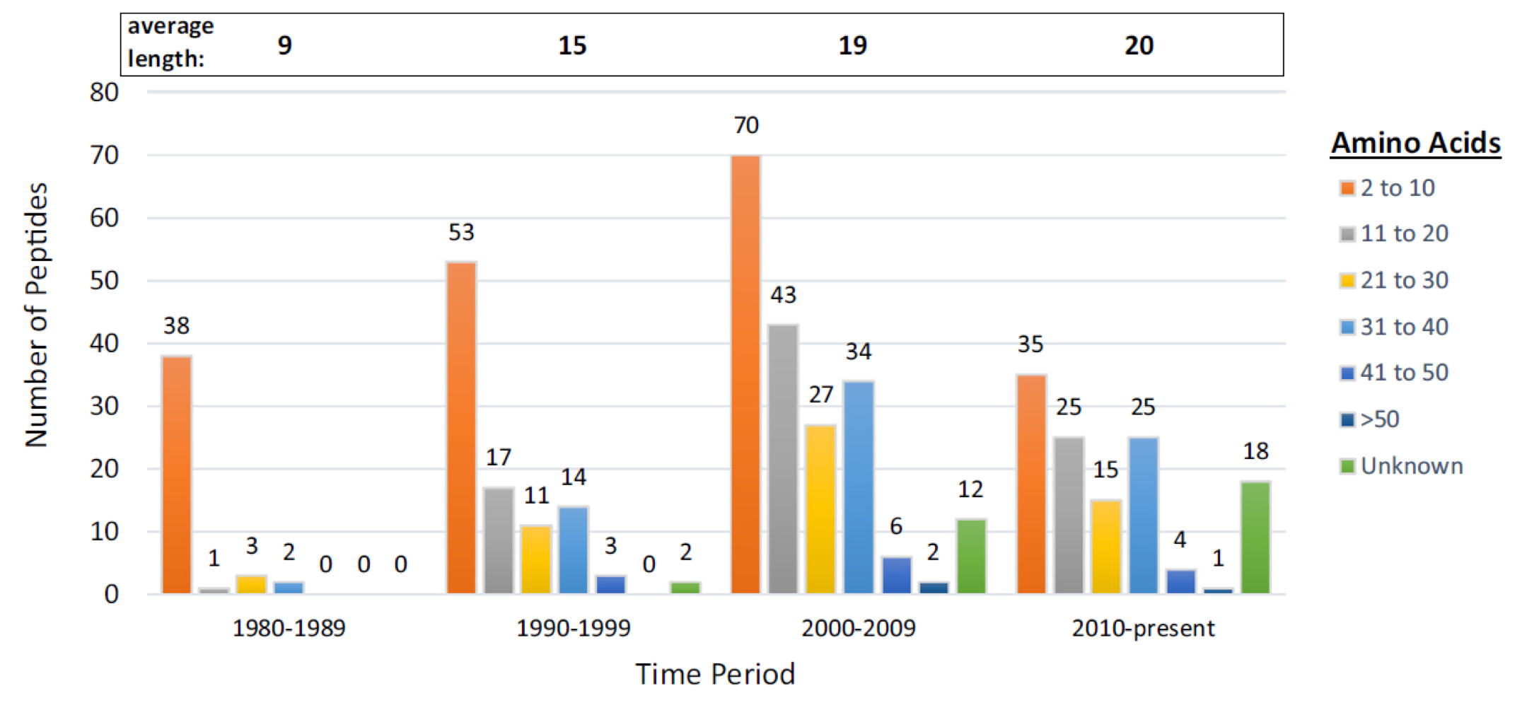 图3. 不同时期临床试验阶段多肽药物肽链长度