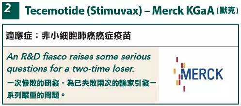 授权自Oncothyreon($ONTY)的tecemotide,在首次临床三期时便面临严重失败;默克集团授权引进后,原来将发展计划作废,但其研究人员再次分析数据时,在子组群分析中发现治疗有效的信号,讯息指出tecemotide受试者若同时接受化学治疗与放射性治疗效果更佳,不过,於日本展开的独立前期研究,却证实结果并非如此,研究也就此停摆。