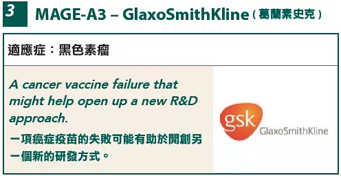 某些未来药物发展的大趋势,也自这些药物计画的残骸中逐渐崭露头角。过去一年中,已有证据显示癌症疫苗单独治疗的效果不彰,癌症疫苗联合免疫检查点抑制剂(Immune check-point) 的鸡尾酒疗法可能成為下一波发展的趋势。
