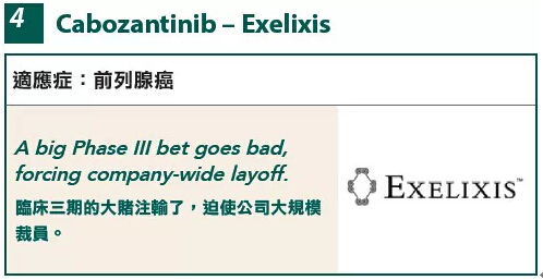 Exelixis遭遇的重大问题是,前列腺癌药物Cabozantinib的首次大规模临床三期在2014年9月溃败,这项消息不仅衝击股价,也引发公司经营策略的危机。面对这次失败,研究人员停止招募COMET-2的人才,也造成Exelixis裁员约7 成的生技部门员工,但计画仍将於年底检验总结果。