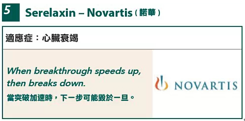 FDA曾於2013年授予Norvatis的重组式人鬆弛素(relaxin-2) Serelaxin突破性疗法认定。在女性人体中,relaxin-2激素上升能放鬆血管以配合怀孕期间的生理变化,而Serelaxin新药则是通过放鬆血管发挥作用,减少患者心臟与肾臟的压力。