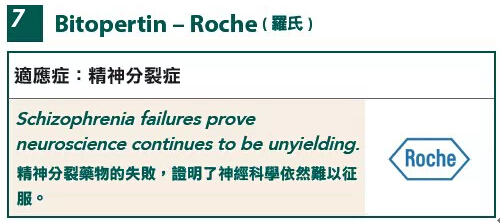 目前,Roche有3个临床一期的精神分裂症候选药物-RG7203;磷酸二酯酶10A的小分子抑制剂;针对脑中谷氨酸系统的选择性小分子正面变构调节剂-RG7342;和未公开运作机制的RG7410。
