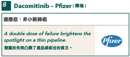 多年来,辉瑞(Pfizer) ($PFE)彻底精减预算和研发,造成后期產品组合大為单薄,执行上更没有容纳错误的空间。辉瑞视肺癌新药dacomitnib為在肿瘤学领域的未来发展关键,因此,dacomitnib临床三期的失败对公司又是一大重挫。