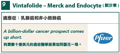 Merck以高达10亿美元买下的新药vintafolide,其临床二期的数据当时刚取得欧洲用於治疗卵巢癌的有条件批准,Merck和Endocyte也公佈了非微小型细胞肺癌中期试验的正面结果,vintafolide作為治疗胰腺癌的未来竞争者,似乎也将来势汹汹。
