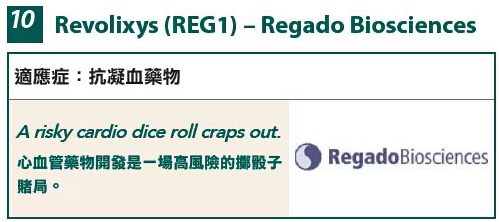 目前,Regado剩餘资產还有包括临床一期的REG2,该药在皮下治疗中使用和Revolixys有相同的活性成分;以及还在临床前阶段的抗血小板药物REG3。