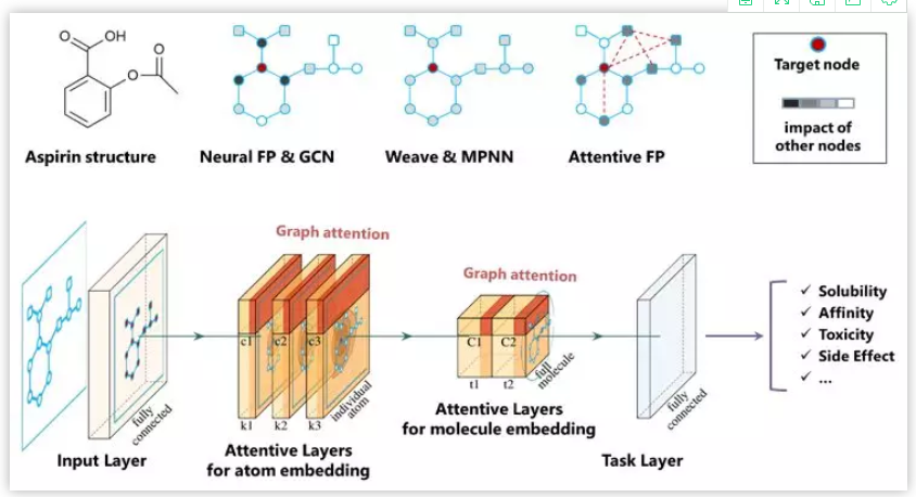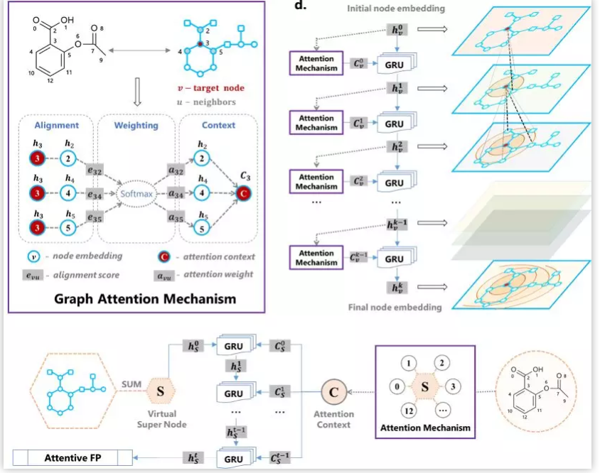 1. Shake-up in AI drug discovery, NatBiotechnol . 2019, 37(6):576. 2. Dragon 7.0. https://chm.kode-solutions.net/products_dragon.php 3. Duvenaud, D.; Maclaurin, D.;et al.. Convolutional Networks on Graphs for Learning Molecular Fingerprints.ArXiv E-Prints 2015, arXiv:1509.09292. 4. Schneider, G. Mind and Machinein Drug Design. Nat. Mach. Intell. 2019, 1 (3), 128–130. 5. Zhou, Z.; Li, X. GraphConvolution: A High-Order and Adaptive Approach. ArXiv E-Prints 2017,arXiv:1706.09916. 6. Kearnes, S.; McCloskey, K.;Berndl, M.; Pande, V.; Riley, P. Molecular Graph Convolutions: Moving BeyondFingerprints. J Comput-Aided Mol Des 2016, 30, 595. 7. Wu, Z.; Ramsundar, B.; et al..MoleculeNet: A Benchmark for Molecular Machine Learning. Chem Sci 2018,9 (2), 513–530. 8. Xiong, Z, Wang, D,; et al..Pushing the boundaries of molecular representation for drug discovery withgraph attention mechanism. J Med Chem. 2019,https://doi.org/10.1021/acs.jmedchem.9b00959 9. Ashish, V.; Shazeer N,; et al.."Attention is all you need." In Advances in neural informationprocessing systems, 2017, pp. 5998-6008.
