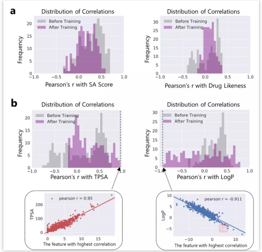 图1. Attentive FP总体框架以及与同类的图神经网络模型比较。 作者比较了他们自己的AttentiveFP模型与其他几种图神经网络模型 (图1) 。如果将分子看作为一张图 (graph) ,给定一个节点 (红色标记的目标原子) ,在Neural FP 【3】 和GCN 【5】 模型中,其他节点对目标节点的影响会随距离严重衰减,这不符合化学直觉,即化学结构中距离较远的原子间有时也会产生较强的影响,比如分子内氢键的形成;Weave 【6】 和MPNN (特指Deepchem中实现的MPNN) 模型则默认所有其他节点对目标节点有相同的影响,这可以更好捕捉分子结构中的一些非局部特征,但显然忽视了化学分子固有的结构。作者提出的Attentive FP能在保持分子固有结构的情况下,有效捕捉图的非局部特征和远距离节点相互作用 (图2) 。这得益于Attentive FP先在原子水平加入注意力机制,学习到分子的局部特征,后在整个分子水平加入注意力机制,学习到分子的全局特征。值得一提的是,相比其他同类图神经网络模型,Attentive FP用了最少的初始特征作为模型输入,依然在多个测试数据集中达到了当前最优的预测表现。 图2. Attentive FP 注意力图神经网络架构。 图3 AttentiveFP学习水溶性时自动学习到的特征与化学家定义的描述符比较。 作者将Attentive FP学习水溶性时自动学习到的特征与化学家定义的描述符进行了对比 (图3) 。可以看到,训练前后,自动学习到的特征几乎能复现出跟预测任务相关的经验描述符。这些经验描述符是根据化学家的专业知识所定义出来的,比如TPSA (拓扑分子极性表面积) 和LogP (油水分配系数) 。因为这些经验描述符与水溶性高度相关,对预测任务有较强的指导,传统的机器学习模型通常会直接选择这些描述符作为输入特征的一部分来预测水溶性。但作者发展的Attentive FP可以不以这些化学先验作为输入,而以更原始简单的输入 (如原子和键的类型等) ,直接在在隐含层中自动学习到的这些人们长期积累的化学知识,表现为训练后的模型隐含层特征与这些经验描述符的相关性变高,而与预测任务不相关的描述符如SA Score (合成难易性) 和Drug Likeness (类药性) 与学习到的隐层特征相关性比较并没有显著变化。 图4. Attentive FP自动学习化学环境。