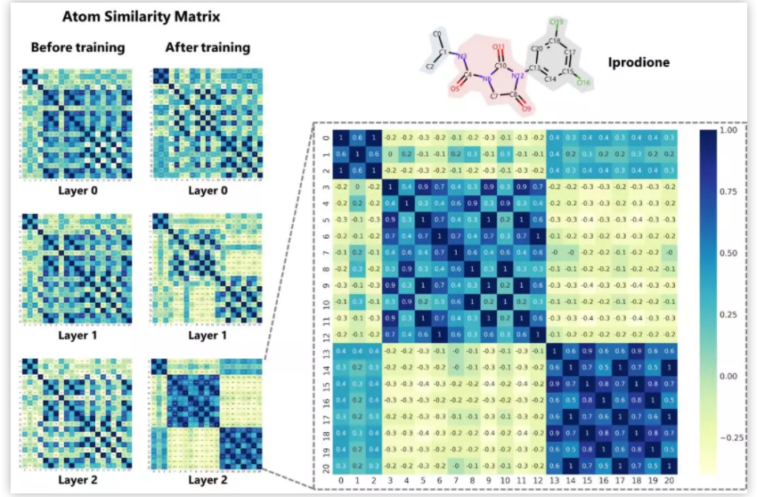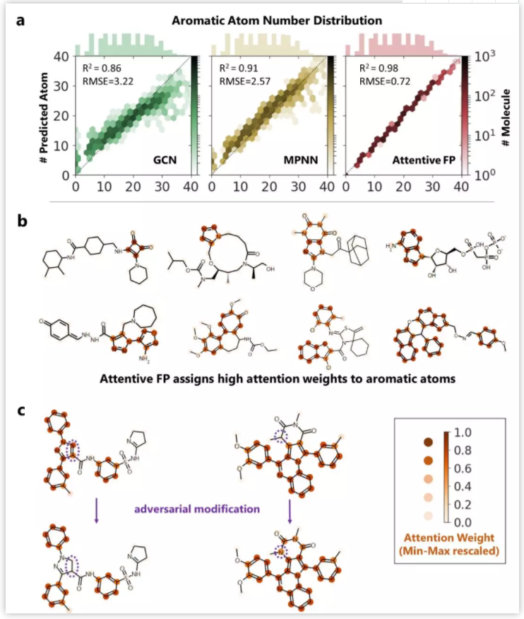 作者发展的AttentiveFP模型还能自动学习到原子所处的化学环境,比如,以药物溶解度作为监督任务进行训练,将模型学习到的原子向量作相似性评估,负相关的原子对标为黄色,正相关的标为蓝色 (图4) 。结果表明通过学习,整个分子显示出特定的结构模式,这种模式在隐藏层的高层更加明显。对于图4所示的Iprodione结构,原子被自动聚集的三个部分正好对应分子结构中的三个片段,其中,分子结构中灰色背景的化学基团极性比较小,不利于水溶性,中间红色背景的基团极性较大,利于水溶性。这一结果提示模型可能自动学习了到各个原子所处的不同化学环境。 图5. Attentive FP自动学习到分子中的芳香性子结构。