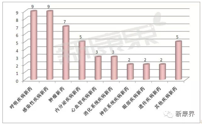 其中,呼吸疾病新药9个,感染性疾病新药9个,肿瘤新药7个,内分泌疾病新药5个,心血管疾病新药3个,消化系统疾病新药3个,神经系统疾病新药2个,眼部疾病新药2个,遗传疾病新药2个,其他疾病新药5个。