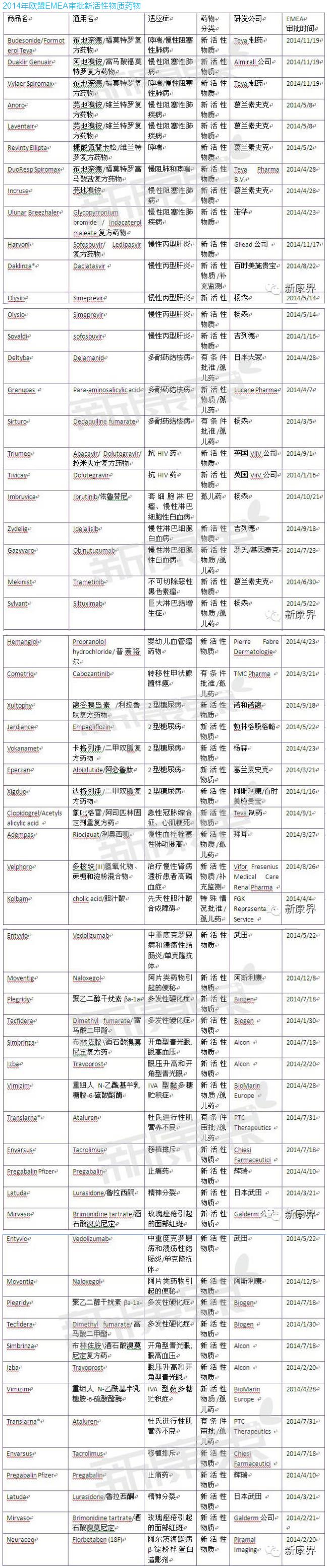 2014年欧洲药品管理局共审批通过47个新活性物质药物,其中哮喘/慢性阻塞性肺疾病新药9个,糖尿病新药5个,慢性丙型肝炎新药4个,多耐药结核病新药3个,白血病新药3个,艾滋病新药2个,多发性硬化症新药2个,青光眼新药2个。不可切除恶性黑色素瘤、巨大淋巴结增生症、婴幼儿血管瘤、转移性甲状腺髓样癌、急性冠脉综合征、心肌梗死、慢性血栓栓塞性肺动脉高、慢性肾病透析患者高磷血症、杜氏进行性肌营养不良、移植排斥、中重度克罗恩病和溃疡性结肠炎、IVA型黏多糖贮积症、止痛药、先天性胆汁酸合成障碍、精神分裂、玫瑰痤疮引起的面部红斑、阿尔茨海默病β-淀粉样蛋白造影剂、阿片类药物引起的便秘各1个药物.