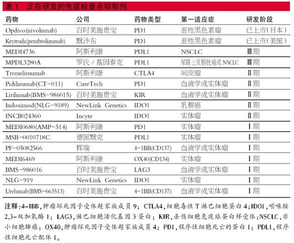 其他还有一些免疫检查点抑制剂处于早期临床试验(如表1),值得关注的是,众多的免疫检查点抑制剂开发者在开发新的作用靶点,如LAG3(淋巴细胞活化基因3蛋白),KIR(杀伤细胞免疫球蛋白样受体),IDO1(吲哚胺2,3-双加氧酶1),4-1BB(肿瘤坏死因子受体超家族构件9)和OX40(肿瘤坏死因子受体超家族成员4)。