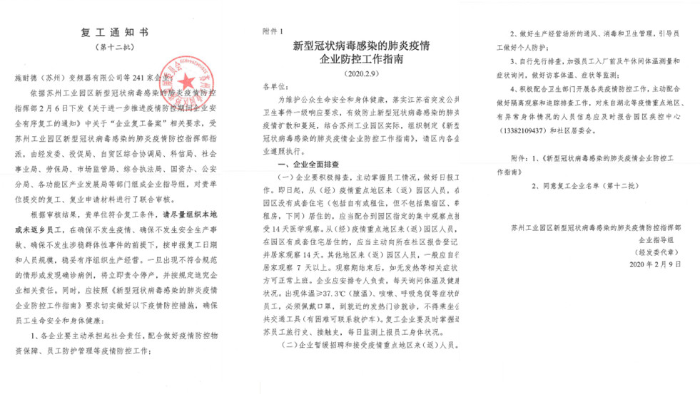 经过严格的政府审查,东曜药业于2月9日正式取得苏州工业园区经济发展委员会发给的复工批文,并在2月10日正式复工。为让更多伙伴安心、放心,特将公司全面落实的防疫工作进行说明,也请同仁们安心工作,主动配合公司防疫工作的推行,让我们共同对抗这一场特别的战“疫”!
