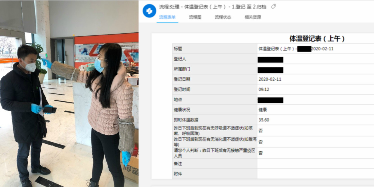 全员每天早上及中午进行两次体温测量,并要上报公司内部线上管理系统,建立健康追踪档案。
