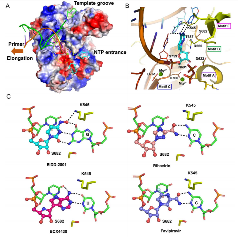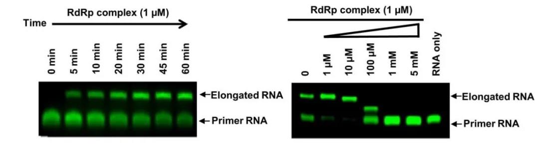 为了阐释新冠病毒与RNA的相互作用,以及瑞德西韦的药物作用机制,研究者们首先通过昆虫细胞共表达了新冠病毒的复制酶三元复合物,通过EMSA实验验证了复合物与RNA的结合,紧接着经验丰富的药物化学家沈敬山等指出三磷酸形式的瑞德西韦(Remdesivir-TP)才有可能抑制RdRp,并合成了Remdesivir-TP用于结构测定,同时,作者们首次利用了体外生化实验,建立了新冠病毒复制酶活性的测定方法,并且通过Remdesivir-TP和Remdesivir设计和建立了药物抑制试验,揭示了Remdesivir-TP才是最终发挥活性的小分子形式。