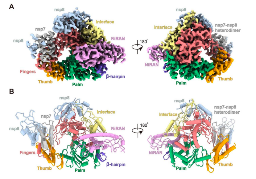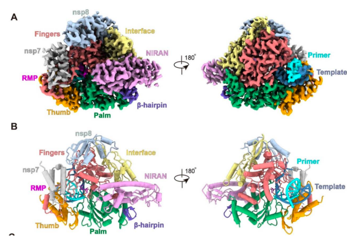 本研究在饶子和院士课题组前期的RdRp研究(详见此前BioArt的报道:饶子和团队解析新冠病毒RNA依赖RNA聚合酶(瑞德西韦靶点)高分辨率结构,该工作已于2020年4月10正式在Science杂志在线发表)的基础上,进一步通过冷冻电镜获得了2.8埃分辨率的apo复合物结构和2.5埃分辨率的复制酶/RNA/瑞德西韦复合物,两个结构总体上十分接近,研究者们在模板引物RNA和nsp12之间观察到广泛的蛋白质-RNA相互作用,其中nsp12共有29个残基直接参与RNA的结合,出乎意料的是,尽管RdRp的RNA结合需要这两种蛋白质,但nsp7或nsp8并未介导RNA相互作用。