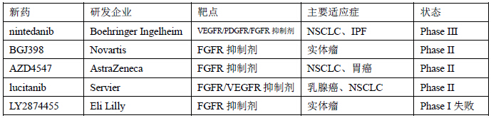 FGFRs与VEGFRs、PDGFRs一样,也涉及肿瘤的增殖和血管的形成,但至今仍然没有FGFRs抑制剂上市。Boehringer Ingelheim研发了VEGFR/PDGFR/FGFR抑制剂nintedanib,用于治疗非小细胞肺癌、特发性肺纤维化,2014年1月获得FDA突破性药物资格。