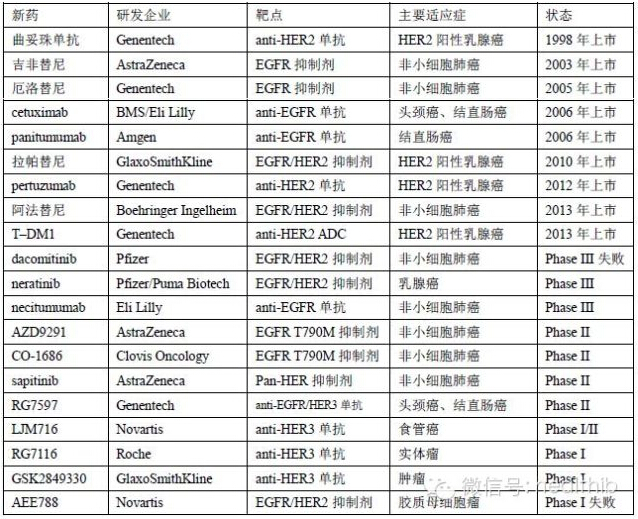EGFR、HER2、HER3都是ErbB家族酪氨酸激酶,已上市的药物包括anti-EGFR单抗、anti-HER2单抗及ADC、EGFR抑制剂、EGFR/HER2抑制剂,用于治疗非小细胞肺癌、HER2阳性乳腺癌、结直肠癌、头颈癌等实体瘤。
