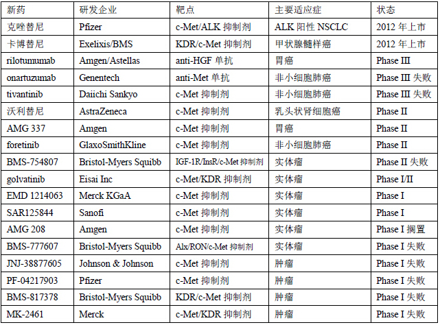 c-Met别名HGFR,与其他生长因子受体一样,也是抗癌药研发的热门靶点,已经上市的c-Met抑制剂有克唑替尼、卡博替尼,但这两个分子抑制c-Met的同时还抑制了其他靶点。onartuzumab、tivantinib治疗非小细胞肺癌的III期临床失败对选择性c-Met抑制剂的研发是个重大打击,可能需要寻找更好的患者筛选方法或适应症。