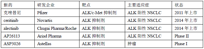 ALK通过基因融合而激活致癌,70-80%间变性大细胞淋巴瘤存在NPM-ALK融合,6.7%的非小细胞肺癌存在EML4-ALK融合。FDA批准的第一个ALK抑制剂是克唑替尼,用于治疗ALK阳性非小细胞肺癌,但克唑替尼对c-Met、RON也有抑制作用。