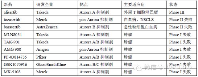 Aurora激酶是调控细胞有丝分裂的一类丝氨酸/苏氨酸激酶,哺乳动物有Aurora A、Aurora B、Aurora C三种亚型,各药企研发了pan-Aurora抑制剂,也研发了选择性的Aurora A抑制剂和Aurora B抑制剂,但基本都在早期临床宣布失败。