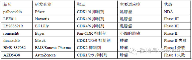 CDK全称细胞周期蛋白依赖性激酶,有CDK1-11等多个亚型,能够与细胞周期蛋白结合,调节细胞周期。Palbociclib、LEE011、LY2835219等三个CDK4/6抑制剂都已进入后期开发,用于治疗乳腺癌,江苏恒瑞自主研发的SHR6390也已申报临床。