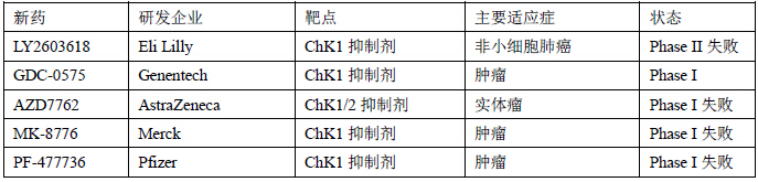 ChK是checkpoint kinase的缩写,有ChK1和ChK2两种亚型,是细胞周期的关键调控子。多家药企开发ChK1抑制剂用于治疗肿瘤,但大多在早期临床研究失败,目前Genentech的GDC-0575正在进行I期临床研究。