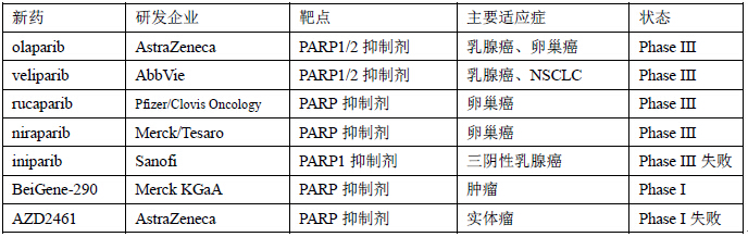 PARP全称poly(ADP-ribose) polymerase,它能够识别DNA单链断点启动修复,最初开发PARP抑制剂用于增强化疗药物的疗效,后来主要针对DNA修复缺陷型癌症。2011-2012年olaparib和iniparib的临床研究受挫,PARP抑制剂的研发走冷,但随着olaparib、veliparib进入III期临床,iniparib被证明不是真正的PARP抑制剂,这类药物的研发复苏。2013年11月德国1.7亿欧元收购百济神州开发的PARP抑制剂BeiGene-290,目前该药已经进入I期临床。