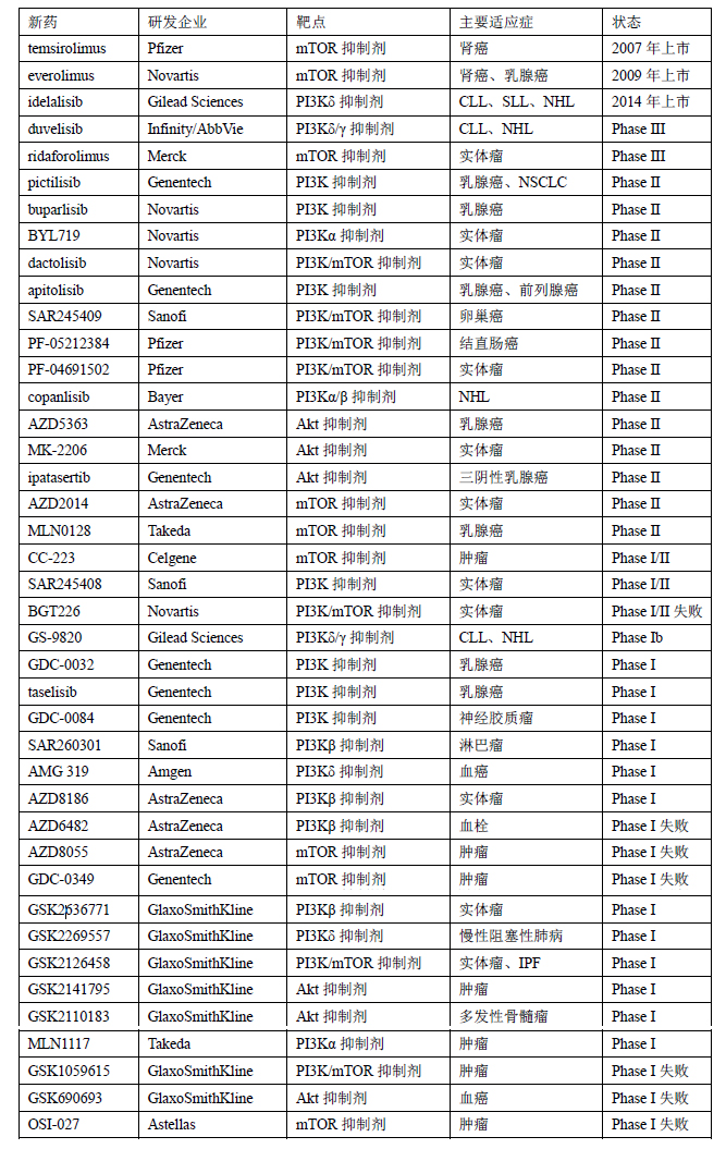 针对PI3K/AKT/mTOR 信号通路的药物包括Pan-PI3K抑制剂、选择性PI3K抑制剂、雷帕霉素类似物、mTOR活性位点抑制剂、PI3K/mTOR双靶点抑制剂、Akt抑制剂。已上市的有雷帕霉素类似物temsirolimus、everolimus和选择性PI3Kδ抑制剂idelalisib。国内自主研发的PI3K 抑制剂有江苏恒瑞的乌咪德吉(PI3K/mTOR双靶点抑制剂)、广州必贝特的BEBT-908(PI3K/HDAC双靶点抑制剂)。