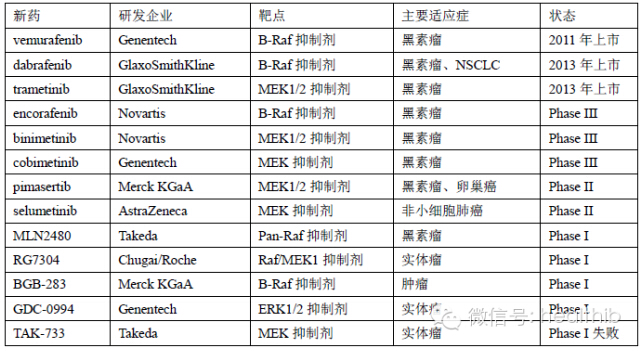 Ras/Raf/MEK/ERK是连接细胞膜受体到细胞核的一条信号通路,Raf有A-Raf、B-Raf、C-Raf三个成员,MEK有MEK1、MEK2两个成员,开发的药物包括B-Raf抑制剂、MEK抑制剂。选择性B-Raf抑制剂、MEK抑制剂主要用于黑素瘤,两种类型的药物可以联用,dabrafenib还被开发用于B-RafV600E突变型非小细胞肺癌,并且获得了FDA突破性药物资格。